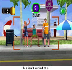 Finally, we have Catch a Wave, the surf shop. Now, you would be forgiven for imagining some kind of surfing minigame, or perhaps something where the twins play the part of lifeguards, and have to rescue drowning swimmers, or maybe even a simple beach treasure hunt using a metal detector and the controller’s vibration function. Nope all around. This is a stalking simulator.