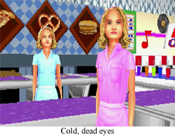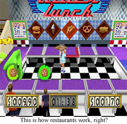 We’ll start with the most typical “video game” level: Lizzie’s Lunch. MKaA:MMM interprets popular teenage hangout spot the food court as some kind of retro 50’s diner. Fair enough, it beats having to shred up newspapers for a Taco Bell entree. Lizzie’s Lunch sees the twin of your choice roller-skating around and fulfilling orders for customers. Somebody ordered a pizza? Roll over to the pizza conveyor belt (or… something?) and then zoom that inevitably terrible mall pizza to the waiting customer. The first level only features customers that all want the same thing, but as the challenges progress, customers will demand different entrees. This, luckily, is wildly easy, because each customer always has the “I want this” speech bubble hovering overhead, so if you have the mental acumen of a three year old, you should be able to slide the circle into the round hole. The greatest challenge is that Mary-Kate and Ashley control like there’s no such thing as traction, which I would blame on the roller skates if they didn’t control exactly the same way on any other mall surface…