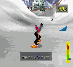 One nice thing, you have the ability to choose your snowboarding opponent, so you can effectively pick your difficulty level. Of course, there’s no real choice at all, as one of your possible opponents is named Slash McCoy. I hope to one day be as cool as Slash McCoy…
