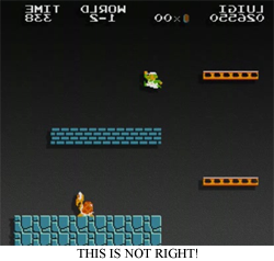 defeated to progress. That’s… about it. On paper, that’s the entire game. In practice, though, there are hours of eclectic gameplay across eight different worlds all because those component pieces are properly rearranged and remixed to lead to all new challenges. Here’s a goomba. Here are two goombas together. Here are some pipes to leap around. Now we’ve got pipes with a hole between, and you’ll be dead if you miss your target. And just when you think you’ve got all this down, here are the Hammer Bros. to ruin your day. Everything splendidly assembles into a complete game, but all you’re really dealing with is a collection of toys spilling out of one basic toy box.