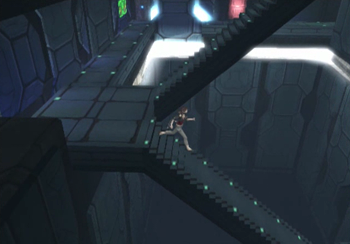 So we’ve got to climb down this completely empty series of stairs to power up a giant elevator.