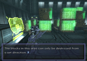 Next room is vaguely puzzleish. You may only destroy these blocks from a particular angle, and I suppose the challenge lies in wandering around the parameter of the room and blasting stuff before you’d just walk up to it like normal.