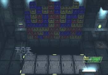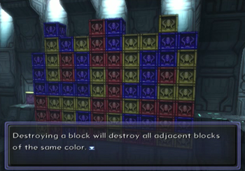 The idea is to reduce this stack of blocks to a two-block high bridge. The trick is that if a block is directly touching another block of the same color, all those blocks will be destroyed simultaneously. The solution is to plan about sixty steps ahead at all times.
