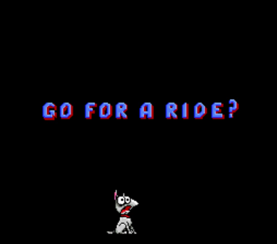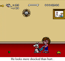 That said, the first world of Family Dog is mostly around-the-house comic mischief. Billy Binsford, the brat of Dog’s family, attempts to harm Dog, and it’s your job to steer the mutt away from danger. There are other hazards, like naked cats and bouncing balls, but your main goal is to simply make it to the right side of the screen without Billy perforating the pooch. Bounce on couches, collect bones, and avoid the vacuum. That thing sucks.