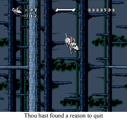 After you finally escape from the pound, the final world is basically just “outside”. It’s supposed to be an unnerving forest or something, but it’s a level very much like the early areas, and its aesthetic seems to be inspired by the similar spooky forest of Amagon. Then you’ve got some random branch hopping straight out of Wizards and Warriors, and… you’re done. Back into the arms of your loving family.