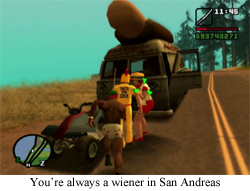 Grand Theft Auto 3 and its silent protagonist made a concentrated effort to make the player identify with the psychopath asked to kill thirty random pedestrians by the strange man on the other side of the pay phone. C.J. of GTA:SA is much more his own character: a man betrayed by the normal rules of society and, eventually, even the love of his companions. C.J. has hopes, dreams, and maybe a solid green suit, and his existence is very different from the tabula rosa of GTA3.