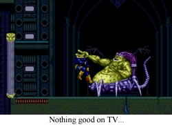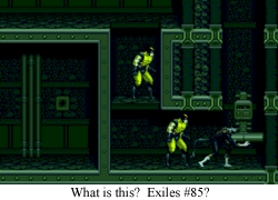 Deep cutWhich brings me to my next point: death and the X-Men. First of all, death means nothing in comic books, so I wouldn’t have minded a game with a life counter. Jean Grey or… was Elixir around at this time? No? How about Angel’s healing blood? How about it was Morph all along? Oh, whatever, point is that there are lot of excuses to bring an X-Man back from the brink. However, in this game, you’ve got Cyclops, Nightcrawler, Gambit, and Wolverine, and that’s it. When one falls, he’s gone forever, and, should you die anywhere in the level, it’s time to completely restart the stage. Boo. Additional boo: you could conceivably switch to a different X-Man with more health when one drops into the danger zone… but each progressive level puts more and more of a limit on how often you’re allowed to switch. So you’re pretty much doomed post Level 2. Hope you don’t want to switch for some random reason like actually finding a situation where a particular mutant power is helpful.