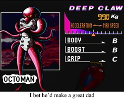 Basically, after covering the controls for ten seconds (also available on a little quick reference sheet, because I suppose there were fears that the N64 controller was too much for mere human brains), the remainder of the booklet is given over to exploring the racers and their ridiculous motivations. Mr. EAD is an android Mario-alike testing its AI. The Skull is the result of science and necromancy. Captain Falcon has an evil clone named Blood Falcon. Even Pico, affectionately simply “the green guy” of the original F-Zero, is an alien ex-military hitman. Dr. Stewart… is still boring. They can’t all be winners. But there’s an octopus man! I love octopus men!