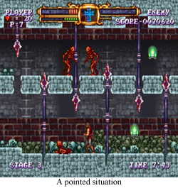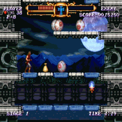 Then there’s the powerup system. Your typical dagger, axe, and holy water are all missing, and now Christopher has the ability to shoot fireballs from his Vampire Killer. That’s good! But you lose that essential powerup after a single hit. That’s bad! And, after another hit, your whip will decrease further into “absolutely useless mode”. Good luck finding another whip powerup before the next far-too-mobile minion. Basically, this adds “The Gradius Problem” to Castlevania: All is well as long as you can avoid getting hit, but the minute that happens, you’re pretty much doomed. Here’s a fun fact: we never needed another reason to be doomed in a Castlevania game. Can we get just one Konami game that you’re not completely screwed after one mistake? Gradius, Contra, Legend of the Mystical Ninja…