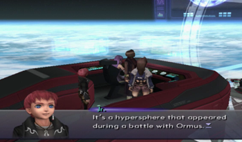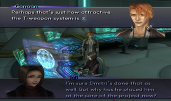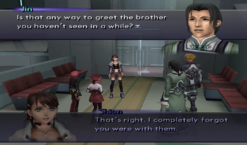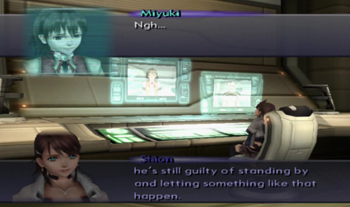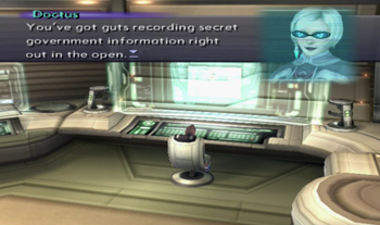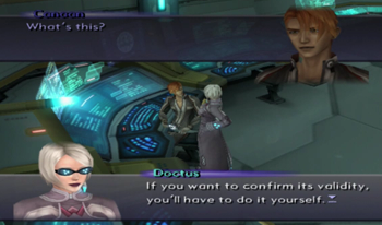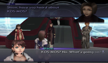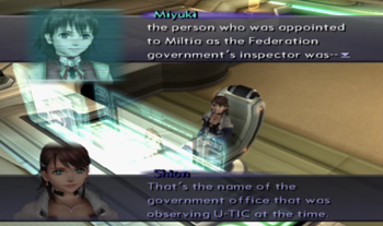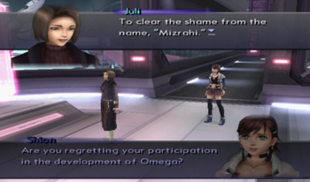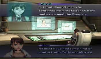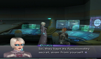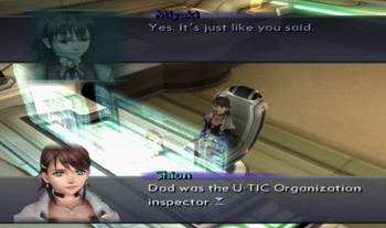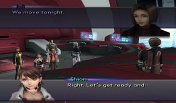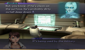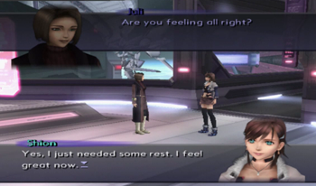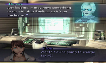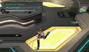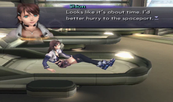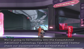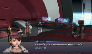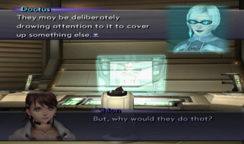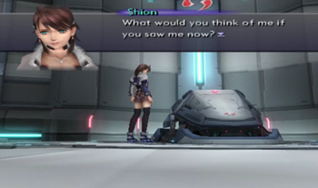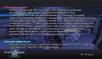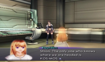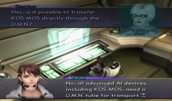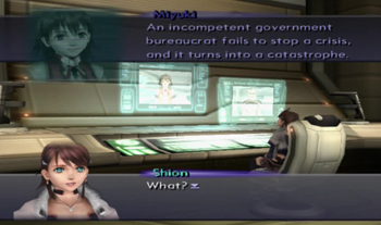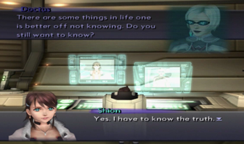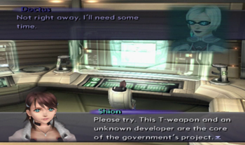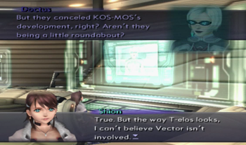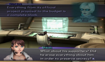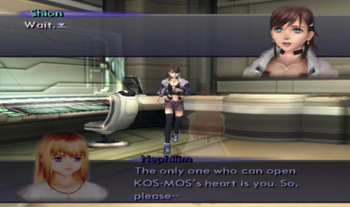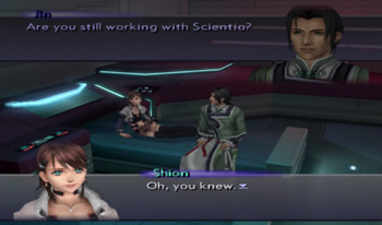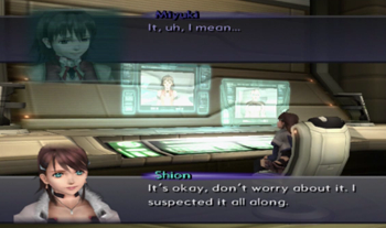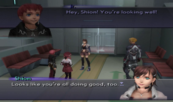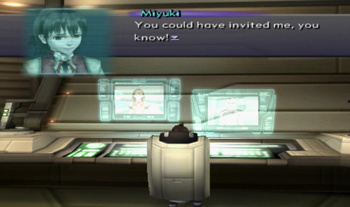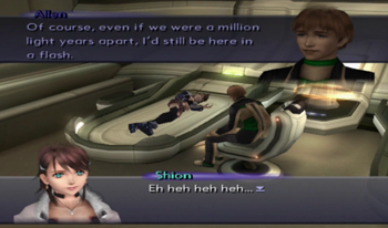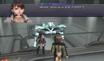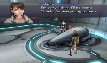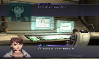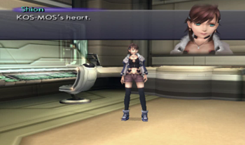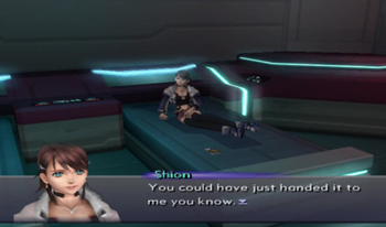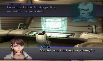 Or head back to Shion’s room, where she reveals that her spiffy viewing glasses secretly recorded the whole T-elos demo. Also the KOS-MOS battle, but she’s keeping that video to herself… for… some… reason…