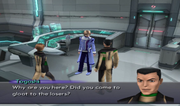 Shion has to walk through the official government viewing area to get anywhere. This seems like a poor design for the building, but it is a fine excuse to overhear random government officials milling about. Or ignore them. Whatever.