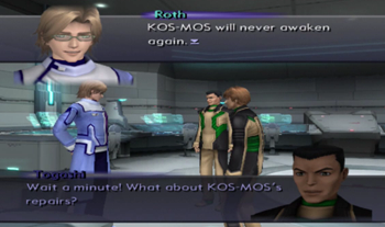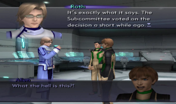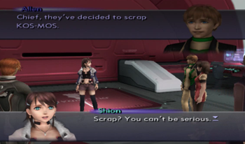 Allen reads Roth’s order… or… something? Anyway, it’s all legit, KOS-MOS (and everybody else) is done.