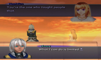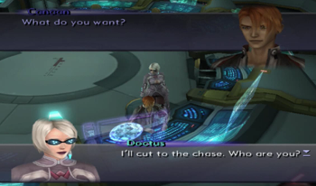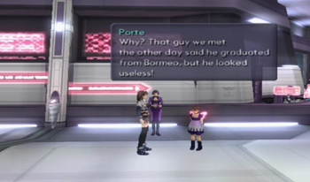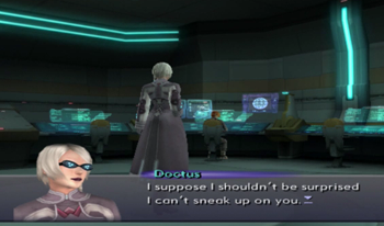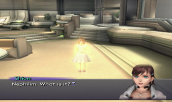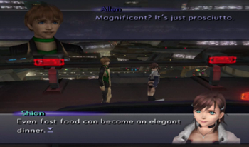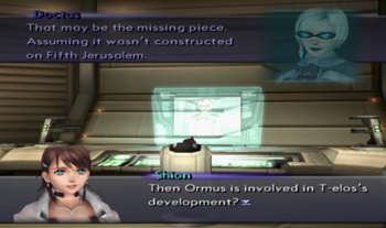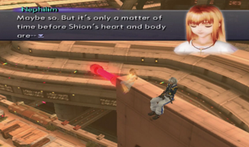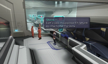 Back at the hotel, Shion is talking to Doctus again. There isn’t any info on what Shion was doing after talking to Nephilim, but I’m pretty sure she was hanging out in the hotel lobby, holding a sign that said “Will perform odd jobs for double techs.” There were no takers.