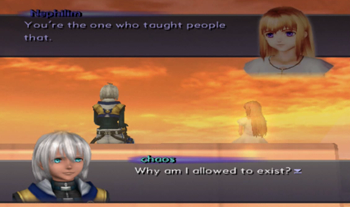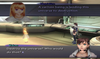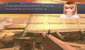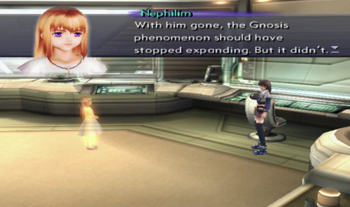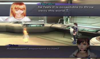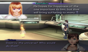 But the really cool bit is Nephilim. Nephilim is on Team Omnipotent, so she knows what’s going on, and, naturally, knows Roth’s identity. That whole “there is a person that wants to save one person but is going to destroy the universe doing it” bit? She’s talking about Roth, too. If you want to get all multiple personality, she’s talking about Kevin. And, technically, she’s talking about the overarching theme of this entire episode. We’ll obviously talk about that more towards the end of the game, but it’s a clever bit of plotting that Nephy basically reveals to Shion/the player the entire reasoning for everything that happens for the complete game.