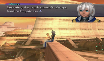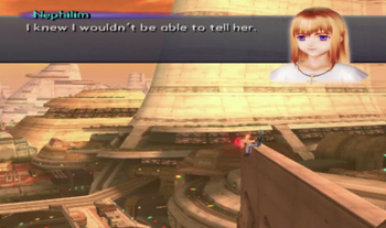 Well, if we’re going to have talking heads, they may as well be talking heads in scenic locations. Here are Nephilim and chaos hanging out on the edge of some building. Maybe Shion’s hotel? We only have models for so many places.