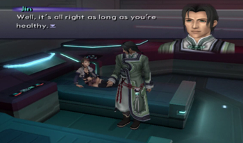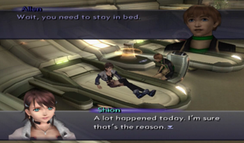 Allen was watching over Shion in the Durandal medbay, and now it’s Jin’s turn. The men in Shion’s life are… subtle.