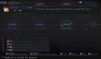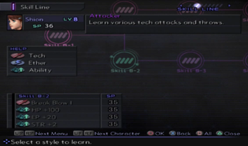 Here’s the Skill Line for Xenosaga Episode 3. It’s really straightforward: you learn four skills per node, and each node requires progressively more skill points. As you might expect, skill points (SP) distribution becomes a lot more generous as the game progresses, so, while we’ve only got 36 SP after the entire first dungeon, we’ll earn that much SP in a single battle in later areas.