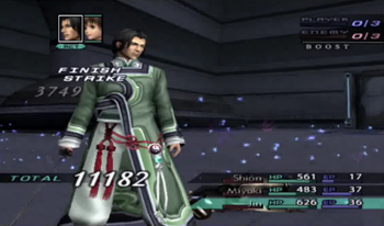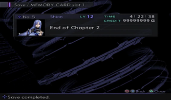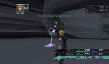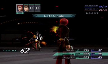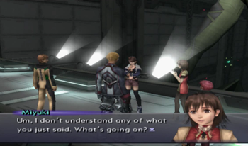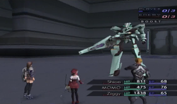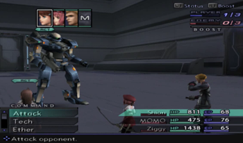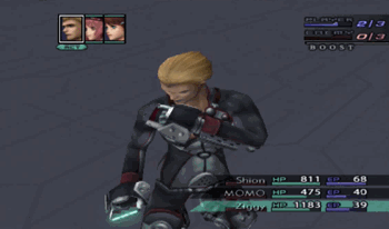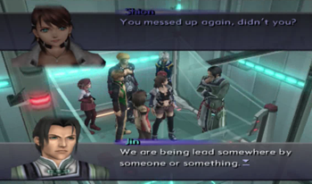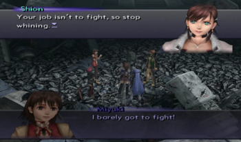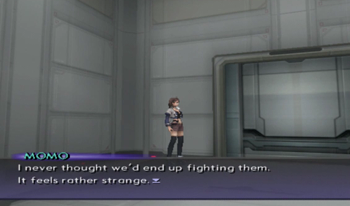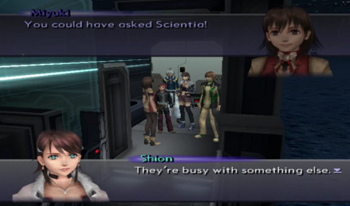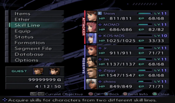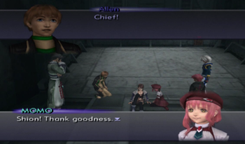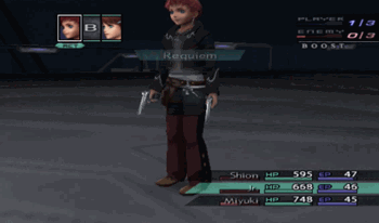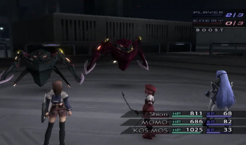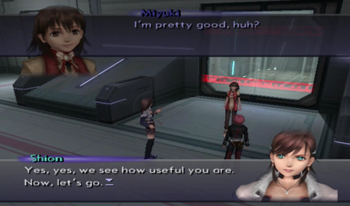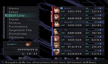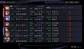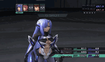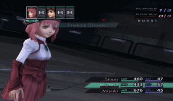 See? There’s the almost complete party. Everyone basically fulfills the same purpose as the previous episodes: Shion and MOMO are mages (though MOMO is a little more offensive this time around), chaos is more red mage, Junior is quick, Ziggy can take a hit, and Jin is fairly balanced. When KOS-MOS finally joins us, she’s the living (kinda) weapon, as usual. Miyuki is basically a limited version of Shion, for the curious…