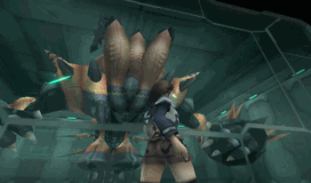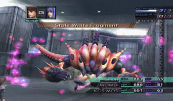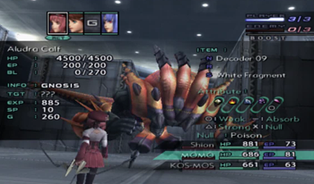 Boss battle! Here’s Aludra Calf. It’s weak to beam attacks, so stick MOMO in there and let her use beam-element “magic”. If you remembered to equip KOS-MOS with that weapon from behind the segment door earlier, she’ll also kick some ass. Also note the 100% drop for this beast is a Decoder key, and there’s a White Fragment for you if you decide to steal.