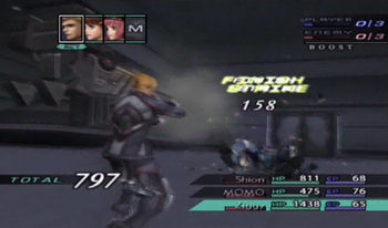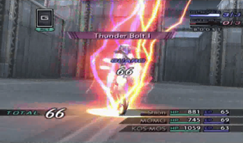Back to random battles. I tried to properly capture Jin’s special attack, but it moves so fast, you can barely tell what’s going on. So here’s Jin standing near a particle splatter that used to be a monster. Incidentally, recall that I maxed out Jin’s strength, so any damage values are insane (and same for KOS-MOS later)(and MOMO’s EATK earlier).