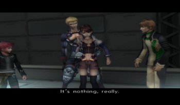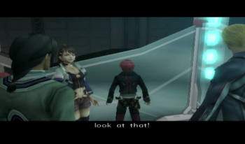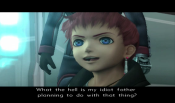Alright, I could complain every update about how the “talking dialogue boxes” really suck compared to the “real” acting of the previous episodes, but I do admit you get used to it pretty fast, and not every scene needs to be acted out. That said, stuff like this, Shion’s silent resignation at the fact that Junior somehow still doesn’t get it (remember the conversation at the beginning of XS2 where Junior has to have it explained to him how KOS-MOS is more than a “weapon” to Shion), really enhances the humanity on display by these characters. Considering that “humanity” is a gigantic theme of the whole XS franchise, well… I try not to get mad at budget cuts.