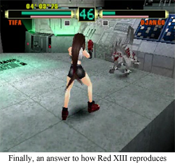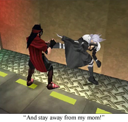 WeeeeNow, here was Ehrgeiz. Not only could Cloud walk, run, and jump at will, but he could battle on a 3-D plane. He could use multiple attacks (some based on Final Fantasy moves, others… not so much). He could block, fall down, and get right back up again. In short, Cloud Strife was now a “real” person… or at least as real as the cast of Tekken 3. Tekken 3, incidentally, is my ruler by which “realistic” graphics are measured exclusively because the girl I had a crush on through junior high (and high school) (and college) (and not insignificant portions of the last decade) who had absolutely no interest in video games took one look at T3’s Eddy Gordo and responded, “Wow, he’s pretty hot.” Aside from sparking a lifelong rivalry with practitioners of Caopeira, this event taught me there’s a significant difference between the “abstract” models of most JRPGs, and the more realistic (and evidently hotter) models of more kinetic games like those in the fighting genre. Cloud had belonged to the former grouping, but now was firmly entrenched in the “real” world of Ehrgeiz.