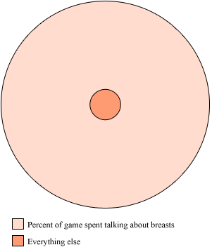 But even with the sins against basic anatomy that is the cast of this game, the sheer amount of useless talky talky here is absurd. If all the dialogue relating to breasts was cut from this game, you’d probably be left with about six conversations. It would be very dull, but it would be a lean, focused game with a fun combat system and a smattering of colorful characters. And… that might not be a bad thing. Unfortunately, what we have is a reminder every ten seconds that you’re supposed to be leering at this teenager’s chest. Even if that was something I wanted from a videogame (or anything), it gets old after its 20th instance, left alone the 20,000th time it’s mentioned.