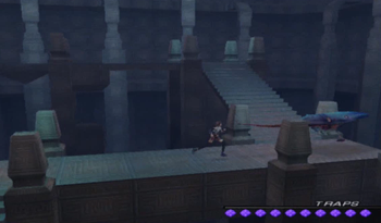 The next area involves our first “trick” with the moving blocks. If you activate this switch willy-nilly, it will shoot a block across the room that will inadvertently release a group of gnosis. Each one of those gremlins is an individual battle… but there’s also a lot of treasure that way, so it works out. Just a warning not to be careless with these switches, I guess.