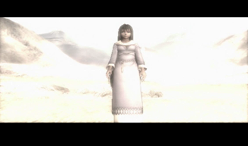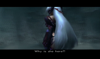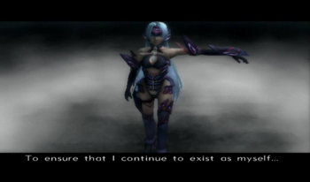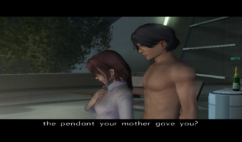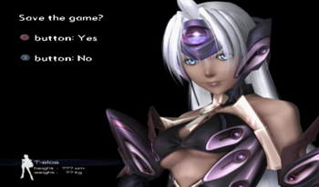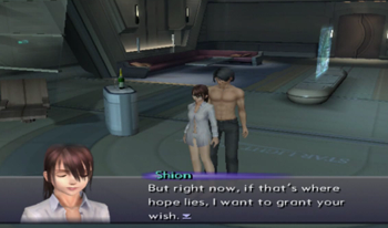 Also, there’s probably some deliberate visual motif between Shion’s white shirt/underwear combo and KOS-MOS’s usual "outfit".