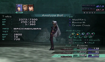 T-elos has the unique “machine-human” designation. This is convenient, as it allows you to use both “works on machines” and “works on humans” attacks against her. She’s also weak to electricity (stupid bot), and strong against beam (not coincidentally KOS-MOS’s specialty).