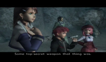 Yeah, right. You straight up lose access to the ESes after this, barring you from heading back here for the next three chapters. And even when you get them back, Shion is immediately captured, and you can’t enter the bonus dungeon with Allen taking her place because the dungeon rejects him for being too much of a wuss (I’m not kidding, I tried it back when I played this). Instead of “next time you feel like it”, you should’ve said “a couple dozen hours from now when you get to Disc 2”.