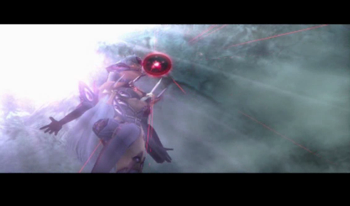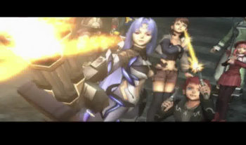 Hard to see in the still, but KOS-MOS taking a cannon to the face is not good for her maintenance.