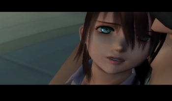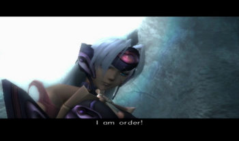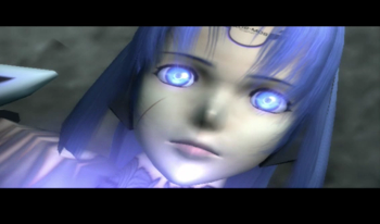 KOS-MOS loses her robot tiara to a properly placed slash.