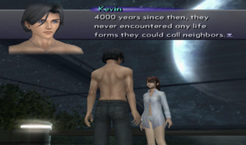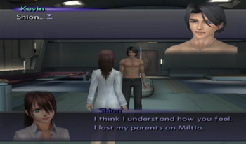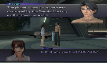 Laying it on a little thick with the “Kevin and Shion are KOS-MOS’s mom and dad” thing.