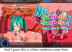 But this Project Diva game had a p…p….plot! The Vocaloids are trapped in some sort of musical limbo, and aren’t even allowed to sing until “you” the player manage a very willing Hatsune Miku to sing through a few hits. Then, once a musical prism has filled with voltage (or… something?), the other Vocaloids are free to sing along through other songs to fill up other prisms. And each prism has a theme like “cool” or “elegant”, and, between songs, the Vocaloids discuss what it means to “be” these abstract concepts. The girls start a rock band! That blue kid becomes an idol! The twins are performing some kind of comedy routine! And it all culminates with a grand performance where they finally make it to regionals! I’m filled with glee!