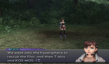 Previously on Xenosaga: KOS-MOS and T-elos got into a bit of a scuffle, and that somehow blew Shion into a forest? Huh?