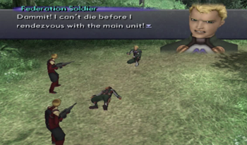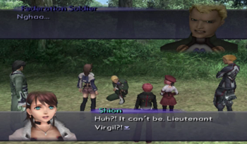 Oh, son of a bitch. Looks like there’s a soldier under attack by Realians, and, yep, it’s pretty obviously Virgil. Let’s call him Soldier Virgil so as to distinguish him from his older self.