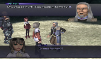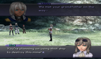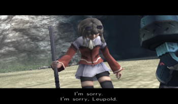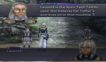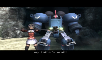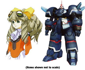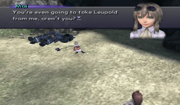 But first, let’s address the elephant mech in the room: Mai and Leopold are dead ringers for Maria and Seibzehn of Xenogears. Well, more appropriately, Mai looks like a teenage Maria (assuming she kept her fashion sense through adolescence), and Leopold could be Seibzehn’s extremely little brother. That said, the parallels of the two characters are obvious, with Mai and Maria both claiming to be protectors of their home, dedicated if rambunctious granddaughters, and the odd situation of a mech that may or may not be possessed by a dead father. It is, frankly, the most blatant Xenogears reference in the Xenosaga franchise.