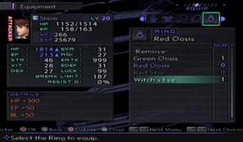 Witch’s Eye is I want to say the first obvious “upgraded” accessory. You’ve likely already got a HP+ accessory, but this one has HP+, EP+, and BL+. So, basically, from this point on, always check to make sure you’ve got the best of the best equipped every time you open a treasure chest. Joy.