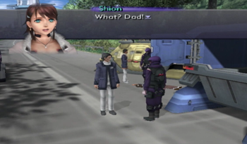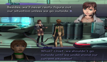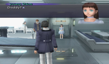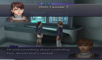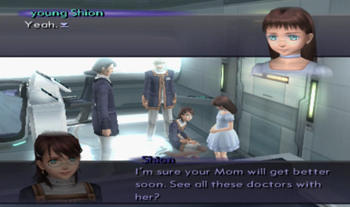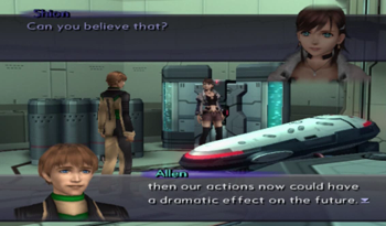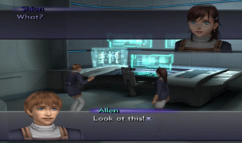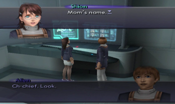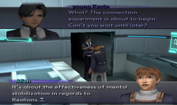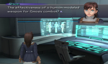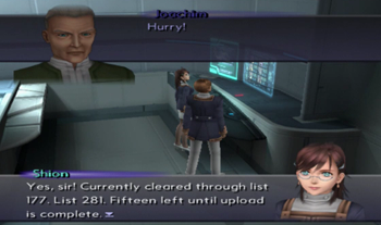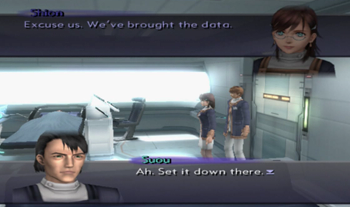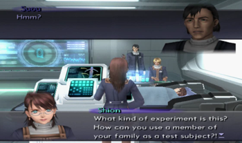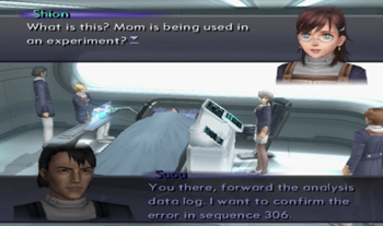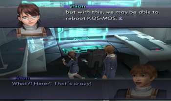 Shion recognizes that they might not be able to kidnap Young Kevin to repair KOS-MOS (though I’m sure she was thinking about it), but downloading KOS-MOS’s creator’s data is a fine consolation prize. This trip to break the timeline has been surprisingly fruitful!