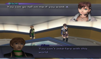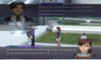 This scene is kind of incidentally important. If you haven’t noticed yet, Shion has Kevin blinders: she basically transforms into a mewling kitten every time he shows up in flashbacks or even gets mentioned in the present. Not that I blame her, mind you, I’m all about romanticizing dead (kinda) loved ones. Here, even if it’s just a jerkass teenage Kevin, Shion is taking her first steps to acknowledging that Kevin is this jerkass just as much as he’s eventually the mature, genocidal adult she fell in love with. Also, don’t diss gardening around Shion.