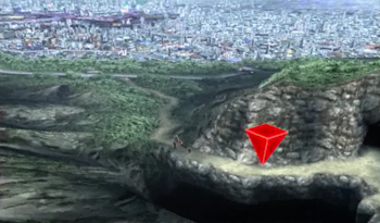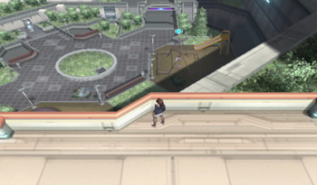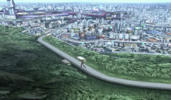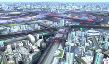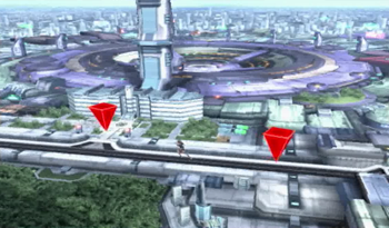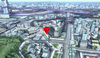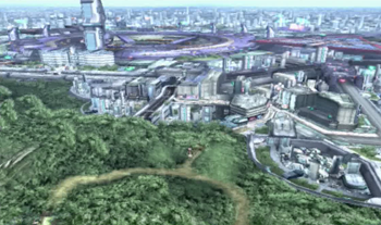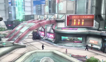 Beyond the U-TIC van is the city proper. I appreciate that someone bothered to stick The Song of Nephilim “top” within range of Shion’s mom’s hospital, so that one flashback in XS1 continues to make sense. There is a surprising amount of attention to detail in this series.