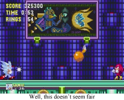 Because StH3&K is a game that should be celebrated. It is the finale of the Sonic the Hedgehog Sega Genesis glory days, and, in my humble opinion, it’s one of the best Sonic games in existence. Sonic the Hedgehog has its share of problems, and Sonic the Hedgehog 2 is great, but it contains those hateful half pipe bonus stages that preclude Super Sonic’s involvement for all but the most dedicated players. It also lacks that certain je ne sais quoi that only a belligerent It's... kind of fun?echidna can bring to the table. StH3&K is one of the few Sonic the Hedgehog games throughout history to feature a final boss that is anything but a grueling slog of memorization or tedium, too. And I’m pretty sure there are like four final bosses in this game, so that’s kind of an accomplishment.