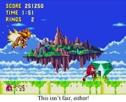 Not quite. There can be issues with combining two comprehensive games. Related to the multiple final boss “problem”, there is a definite climb in difficulty to reach the final stage of Sonic the Hedgehog 3… and then you’re right back at the relatively easy difficulty of the start of Sonic & Knuckles. And, while S&K may be a shorter, faster game than StH3, it still feels rather limiting to conquer the Death Egg and Heavy Arm, only to float down to a stage that is roughly as difficult as cooking ramen. And I don’t care what anyone says, it sucks to arbitrarily lose Super Sonic/Knuckles between games because you’re trying to earn Hyper Sonic. I want to run around at the speed of sound right now! Oh, and somehow the two games contain two zones that are mostly ice stages, and that’s one ice stage too many.