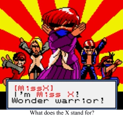 Hm.And it’s all tied together with a “plot” that does not in any way take itself seriously (or come off as too exploitative, either. Can’t stress that enough). Each of “the gals” are competing in this Queen of Fighters tournament to win a talisman that will grant one wish. Want to guess some of those wishes? Well, Athena wants to have long hair again, Yuki her own gym, and Shermie needs a bigger cage for her pregnant hamster. Also, Mai’s ending involves a bad dream where she imagines her lover, Andy Bogard, is secretly a woman. Speaking of which, the final boss of the game is the mysterious Miss X… who is actually just Iori (King of Fighters’ makeshift Vegeta) in completely unconvincing drag. I don’t think it does anything to help transsexual relations, but, as the British are well aware, a “manly man” in a completely incongruous dress is always going to be funny.