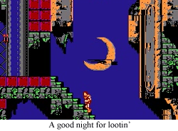 kachingCastlevania was released in the age of the score, those halcyon days when, in the transition from arcade to home console, every game had to have a “kept” score. Presumably, this was to make it seem important to attain the “high score”, and some additional game replays could be wrung out of “sure, you beat it, but now try to beat it better.” And, in a number of games, your score could be increased by gathering some kind of collectible, whether it be money or strange little dots. Sometimes there was an explanation: Mario collects coins, because an extra life may be purchased for a hundred (this is likely why toads are always so nervous: they know the exact value of life in the Mushroom Kingdom). Mega Man accumulated orbs in his first adventure, but forsook the process by the time mecha dragons floated into the picture. Monster Hunter Arthur grabbed bags of loot throughout the Demon Realm, and Scrooge McDuck was just plain hording his wealth. Anybody know a place I can cash in this moon cheese?