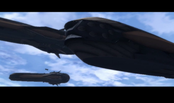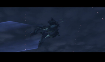 A delightfully clever moment when the heroes travel back to Old Miltia in the past somehow, and ES Asher, piloted by Past Canaan and Past chaos, drops their beam rifle, and it nearly crushes time traveling Jr. He yells up at the ES Asher, and current, time traveling chaos looks sheepish and apologizes.