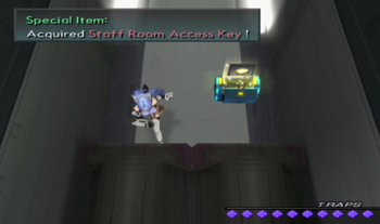 On the way to the interrogation room, there’s a really obvious chest with a key that unlocks the Staff Room a few hallways back.