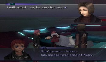 One meaningless soldier battle later, and we’ve got Juli, Mary, and that dog Junior picked up during the ending of XS2. Remember him? Someone finally did.