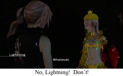 This, of course, is not by accident. Like Cloud before her, Lightning had to be reduced back to her core components in order to be “recognizable” as the same badass from Final Fantasy 13 promotional materials. In this case, the story uses the bluntest tool in its arsenal (okay, second bluntest, an outright retcon would be worst), and basically says “a wizard did it” to the now overly stoic Lightning. Lightning had her emotional core/heart/Claire torn out by a vengeful god, and now she’s super sad about not having emotions anymore. But just because the story offers a reason for a character’s regression doesn’t make it forgivable. The Lightning that was capable of making good intentioned poor decisions (like, say, giving a knife to a vengeful teenager) is gone now, and all we’ve got is a mechanical war machine that occasionally comes around to “Hey, something seems off.”